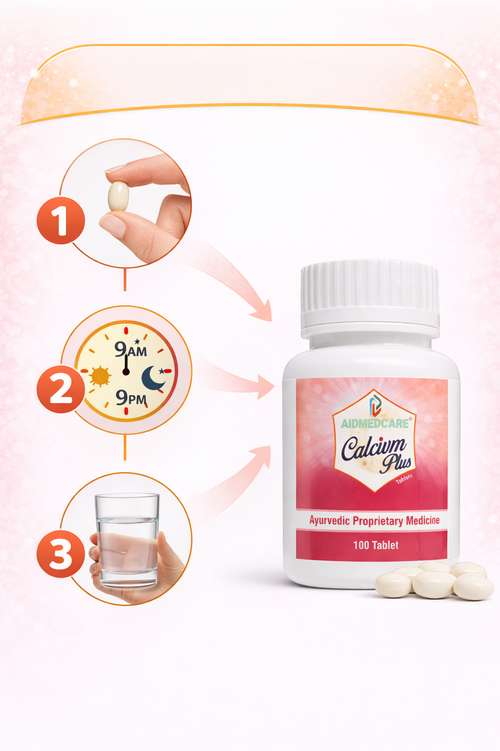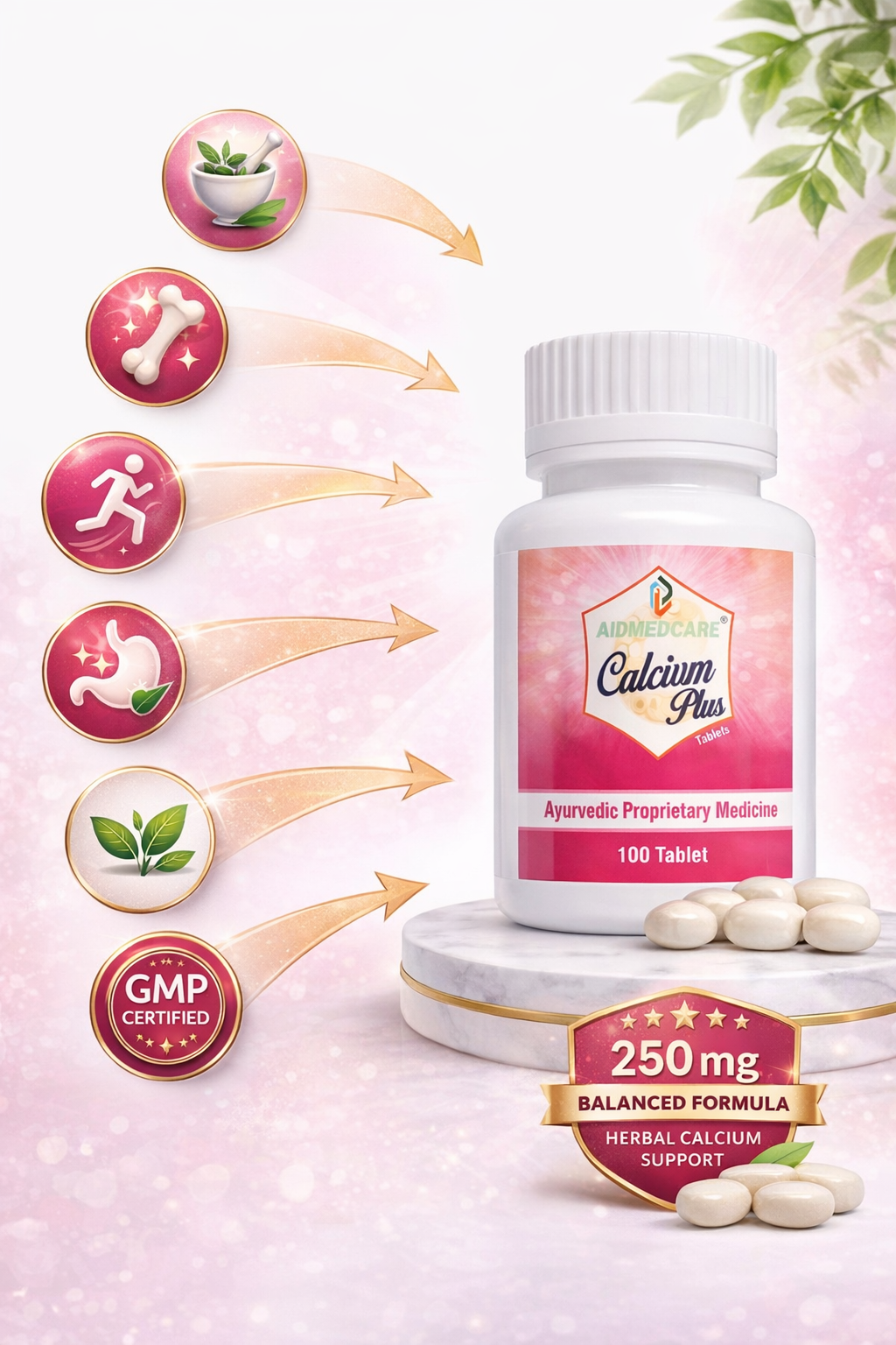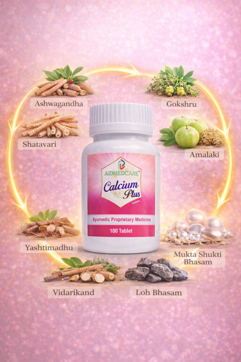 Aidmed Care Calcium Plus Tablets ek advanced Ayurvedic calcium supplement hai jo specially design kiya gaya hai strong bones, healthy joints aur daily energy support ke liye. Isme powerful Ayurvedic ingredients jaise Ashwagandha, Shatavari, Gokhru, Mukta Shukti aur Loh Bhasma ka balanced combination hai, jo natural calcium absorption ko improve karta hai aur body ko andar se strong banata hai.