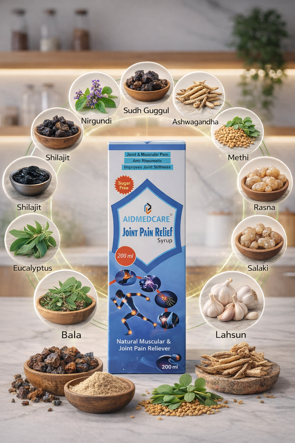 Nirgundi, Sudh Guggal, Ashwagandha, Bala, Eucalyptus, Lahsun, Salaki, and other proven ingredients.