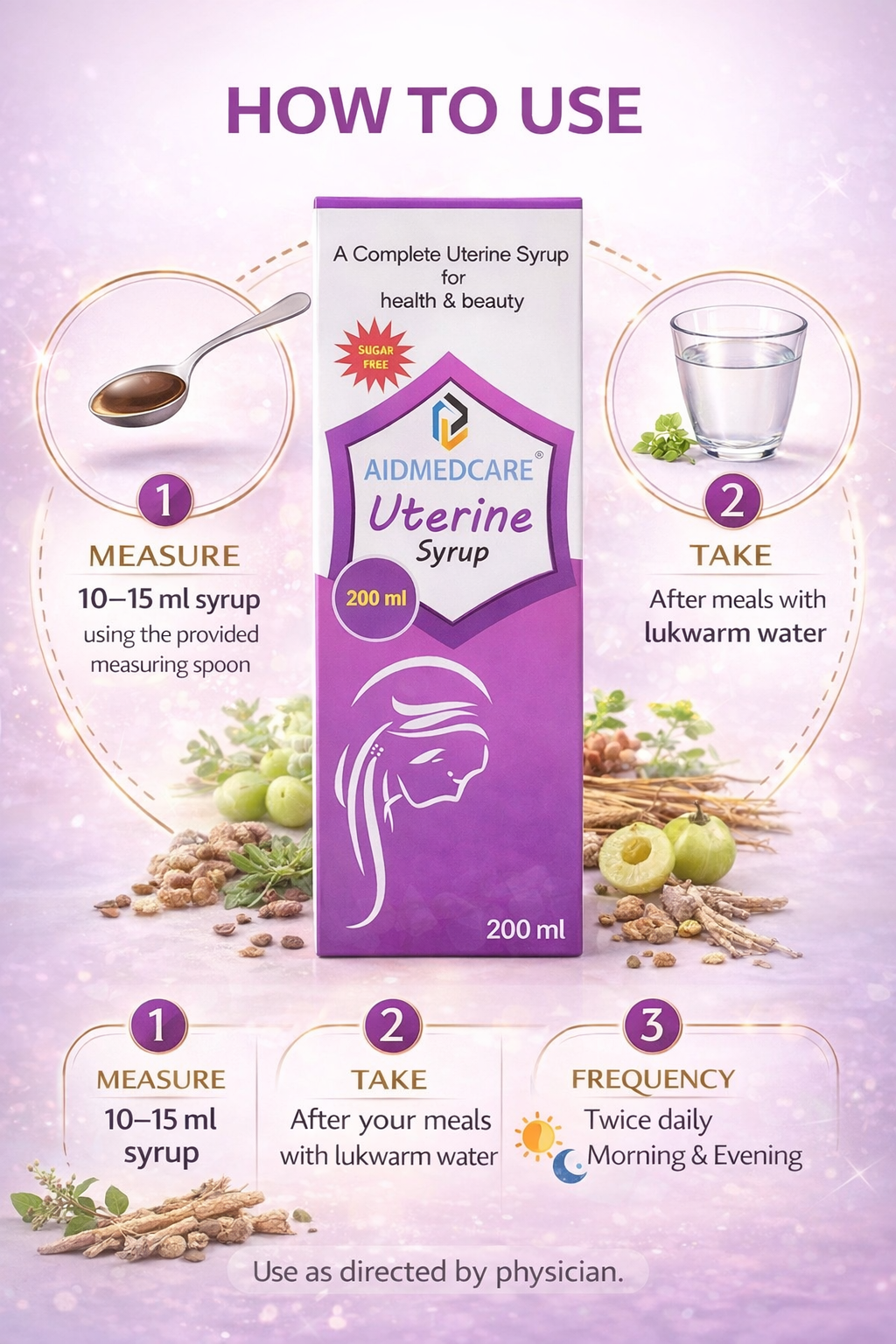 Aidmed Care Uterine Syrup contains a balanced blend of 14 powerful Ayurvedic herbs, traditionally known to: